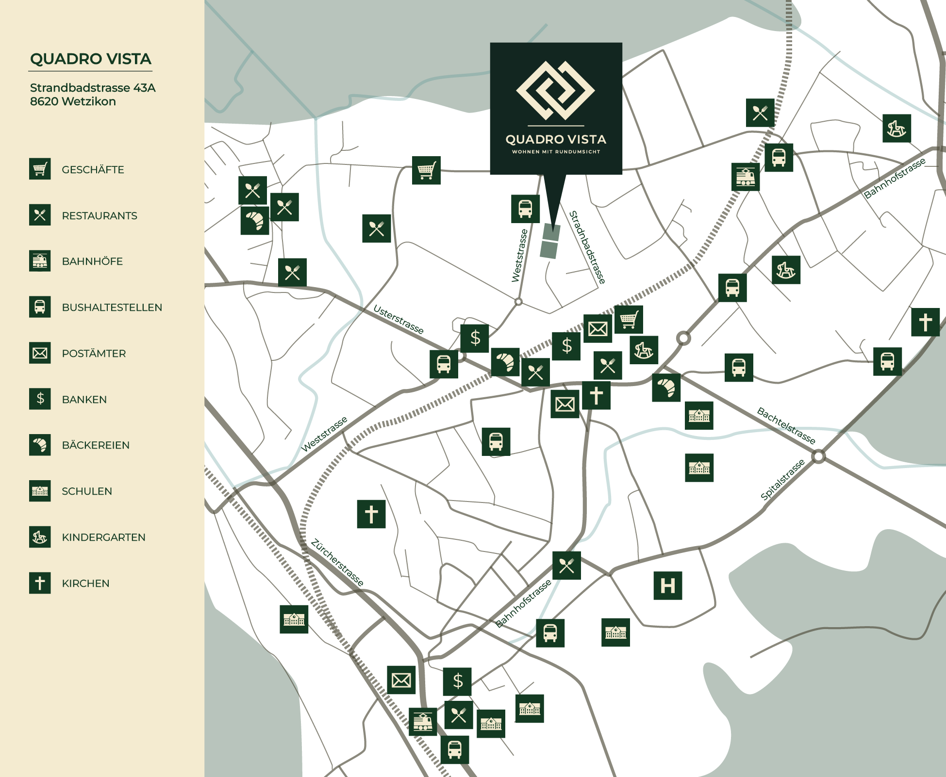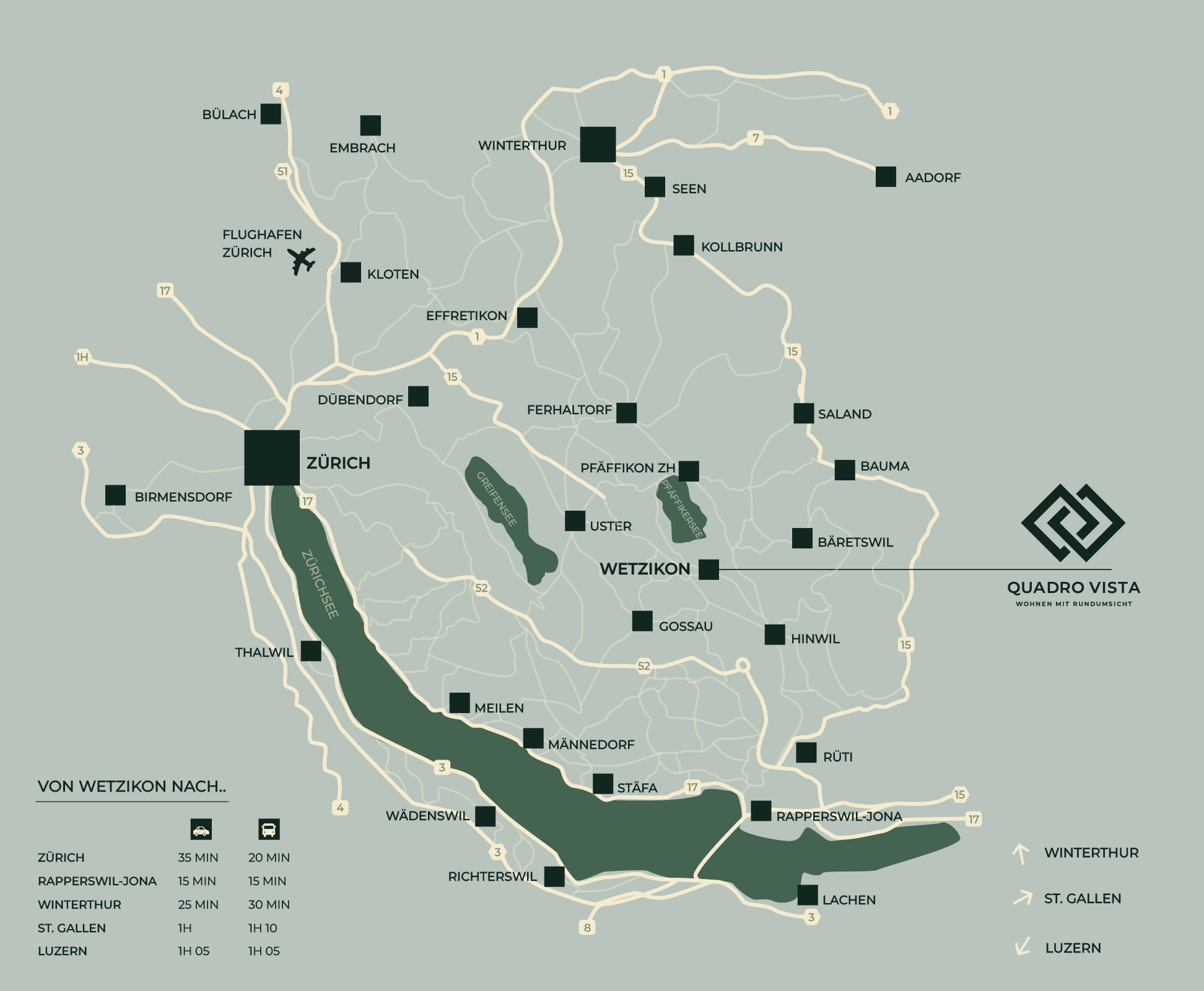 Die Lage von Quadro Vista verbindet Ruhe und Erreichbarkeit auf ideale Weise. Nur zwei Gehminuten entfernt befindet sich die Bushaltestelle, und der Bahnhof Kempten ist in dreizehn Minuten zu Fuss erreichbar. Zürich, Rapperswil und Winterthur lassen sich bequem sowohl mit dem Auto als auch mit öffentlichen Verkehrsmitteln erreichen, wodurch Berufspendler ebenso profitieren wie Menschen, die die kulturellen Angebote der umliegenden Städte schätzen.